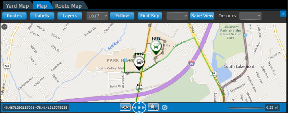 Maintenance staff can select a vehicle record from the Status tab to see its location on the map quickly, or use the Find Vehicle menu (near the center of the screen below) to quickly locate a vehicle by its ID, so it displays on the Operations map. This is useful for vehicle swaps and more: