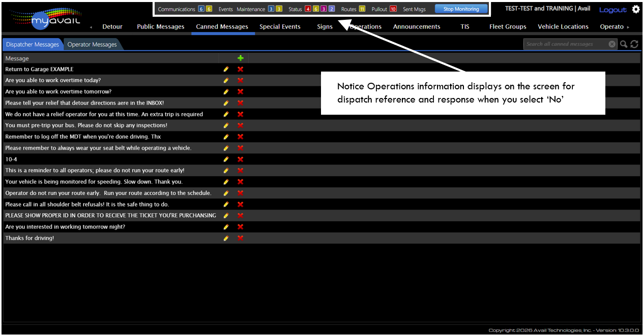 Press No to continue monitoring service . A high level information bar remains visible on the screen; enabling you to manage any issues that may arise in Operations. The system considers you to be an active dispatcher.