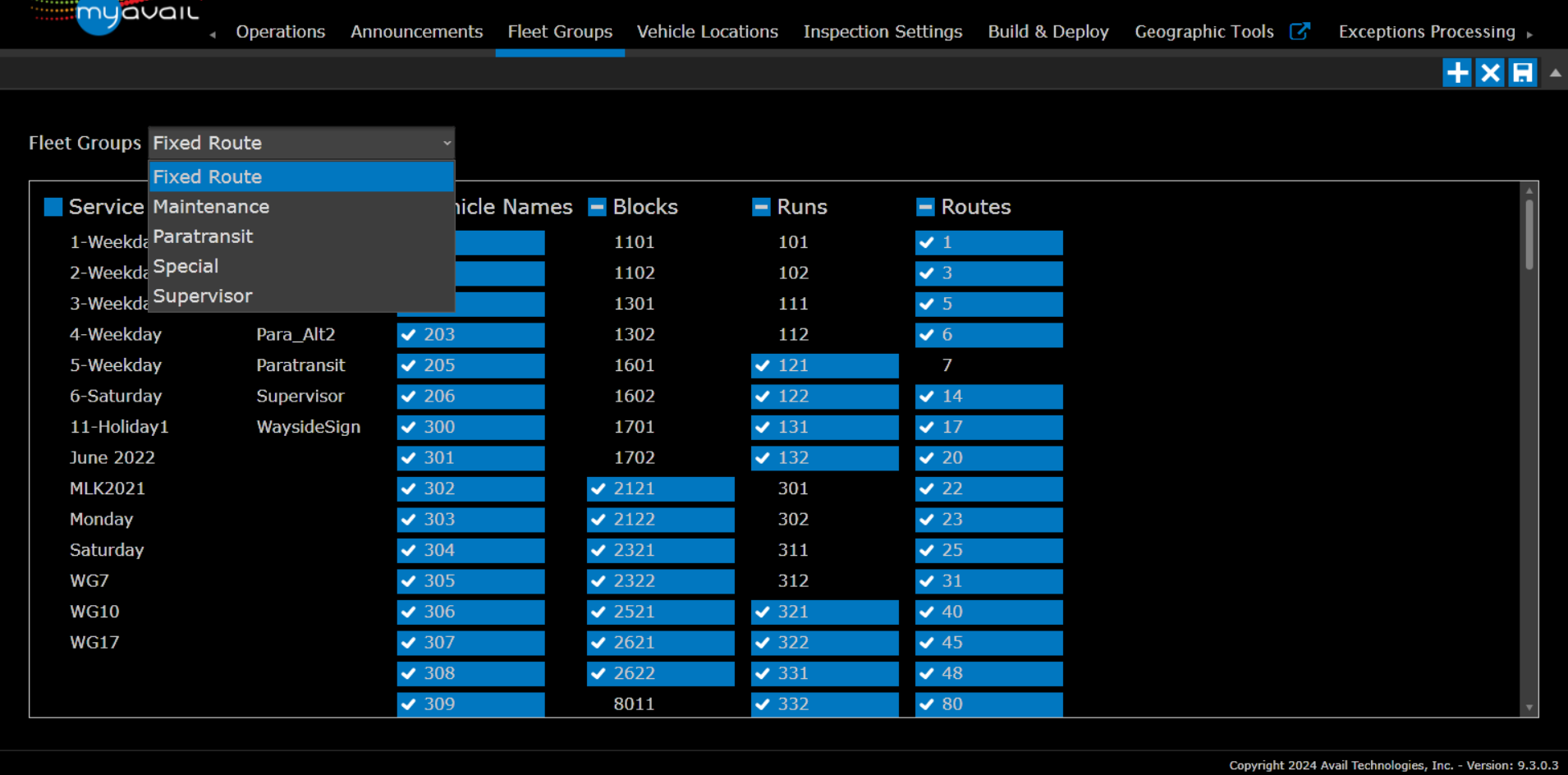 You can use different criteria to define fleet groups. To define a fleet group, select values from one or more criteria lists. Because some of the criteria are valid only when an operator is logged in to a vehicle (such as the block/run or route that the vehicle is operating on), myAvail defines a default fleet group for each vehicle in the system. This default group ensures that all vehicles belong to a fleet group.
