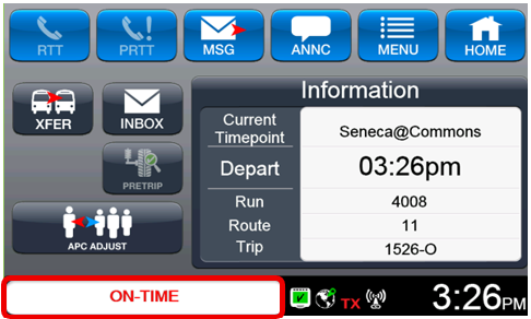 The bottom of the MDT unit displays the Status Bar. This area provides important status messages regarding connectivity to the IVU, operators see OTP updates, etc. Examples can include LOGGED ON, Late 4 Minutes, Wait X minutes to Depart, on-time, as well as other information