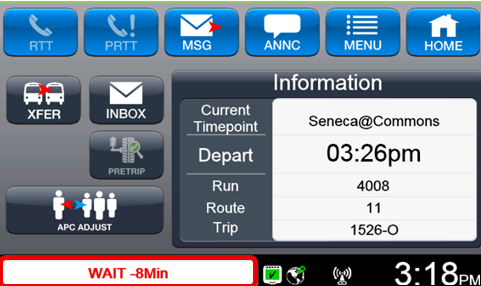 | WAIT #Min | The vehicle is at a timepoint and is running # minutes ahead of schedule. If it can be done safely the operator should wait to depart. |