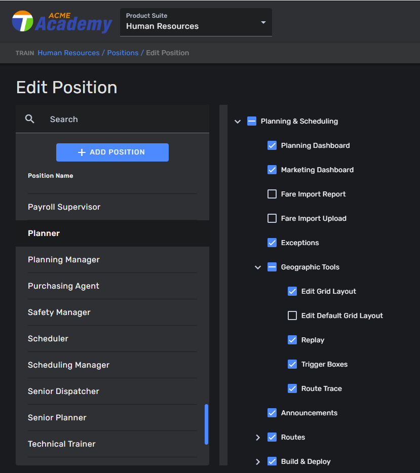 Schedule data is the foundation of your ITS system and data collection is measured against it. The default Planner position is appropriate for staff that manage creating the digital schedule (scheduling package vendor), making service changes, analyzing collected service data in BI planning reports for any needed service improvements, and maintaining the schedule data in the system. This position will be a primary position at a property with dedicated planning/scheduling staff. At a property where other staff maintain the service schedule, the role could be filled by a secondary position.