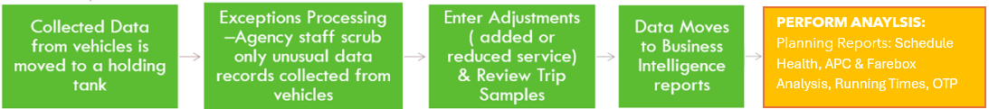 | Setup | Planners use this area to review imported schedule data, miles, hours, trips per day, active routes, review imported service levels, enter manual special service pieces, and related fares - for collection outside of your standard system. Other entries may include fare structures for the MDT interface, company data, garage information, vehicle information, etc./enter System Adjustments here> feeds into overall NTD metrics |