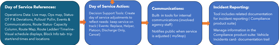 | Operations | Operations is populated by data collected from vehicles in real time. It includes a map interface, communications, and events tracking. This area is monitored by Dispatchers, Bus Supervisors or anyone involved with day-to-day operations who provide support to vehicle operators in service. |