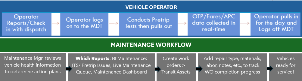 | Business Intelligence | The card used to review data collected from vehicles logged into revenue/non-revenue service. Key Planner Reports: Schedule Health, Running Times, OTP, Ridership/Farebox reports. BI provides standardized reports for Operations, Planning, Maintenance, Execs, Managers, Safety Trainers, and more. BI reports provide valuable metrics needed for agency reporting needs and, most importantly, for analysis of your system. |