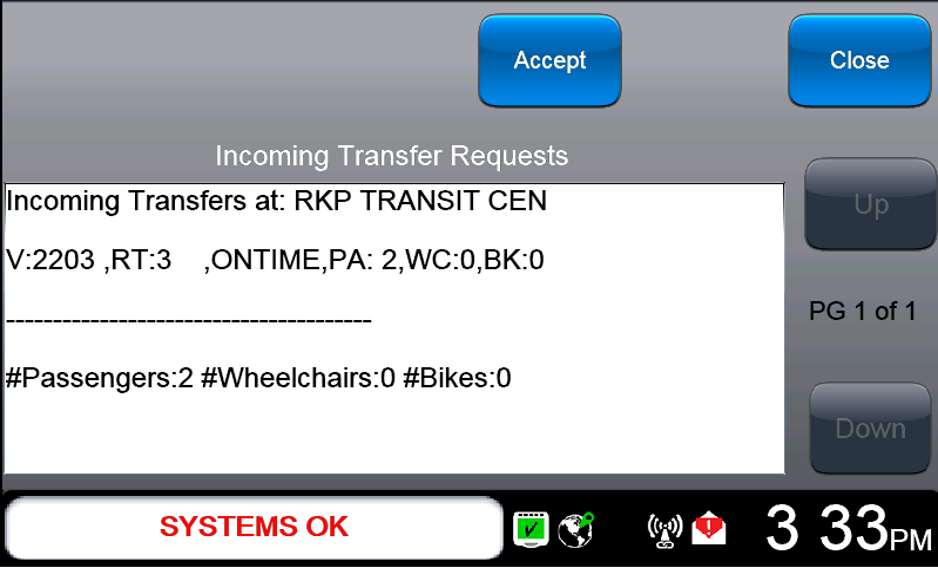 Operators can request and receive notifications for passenger transfer requests through the MDT (mobile data terminal). When the operator of the originating vehicle initiates a passenger transfer request, the myAvail system verifies that the transfer is possible and that it can fit within the schedules of both vehicles.