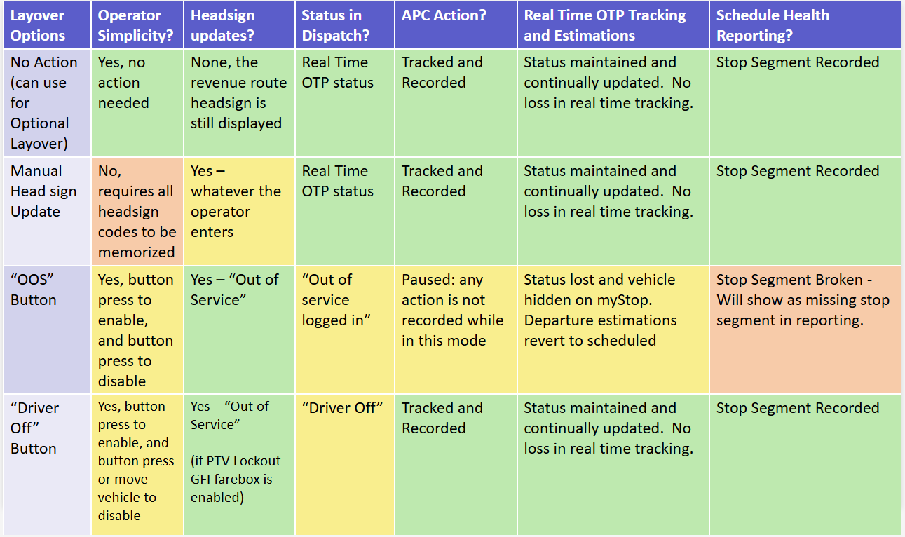 The Optional layover feature is not commonly used. It’s a special type of layover where the operator will drive the vehicle away from a trip change stop location earlier than the scheduled next trip departure time because they are not permitted to remain at the trip change stop location for the entire time between their arrival time and the next trip departure time.