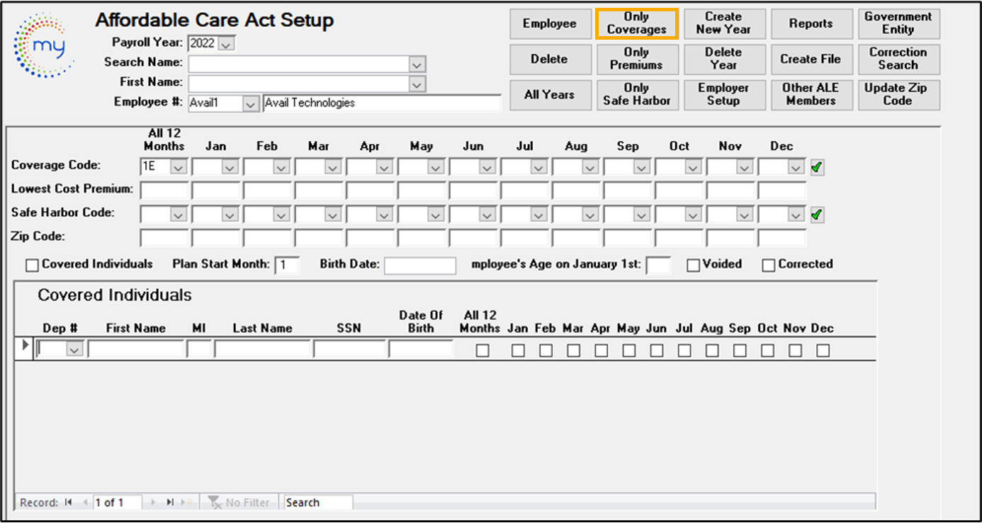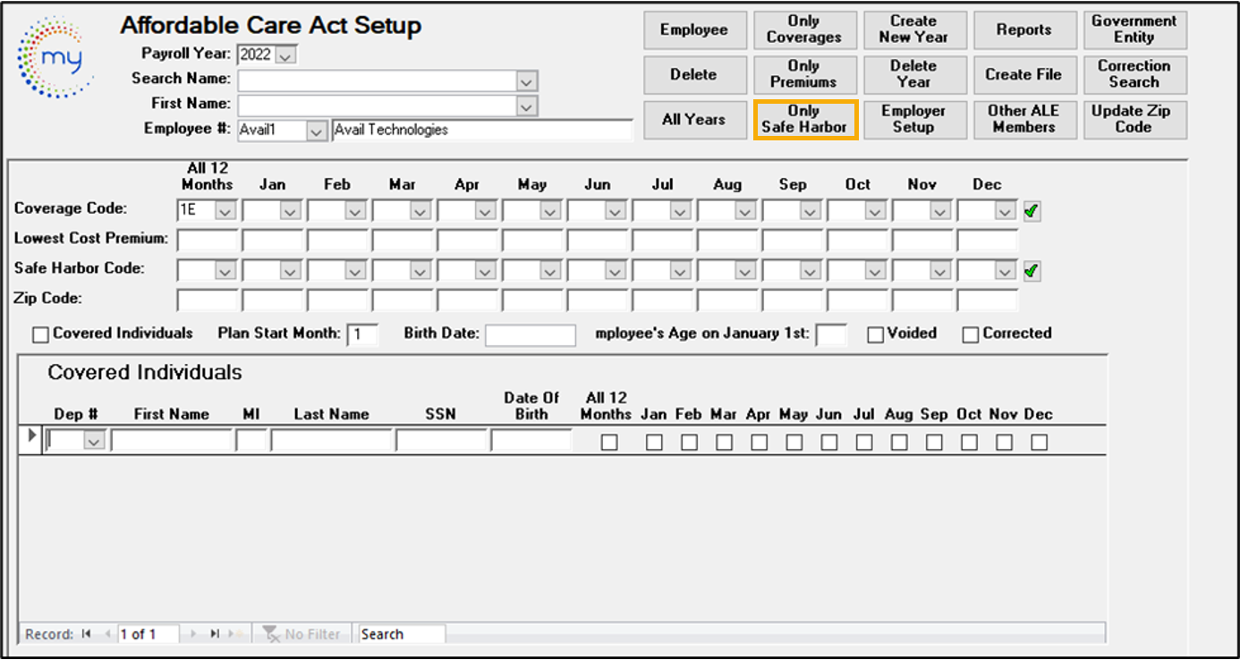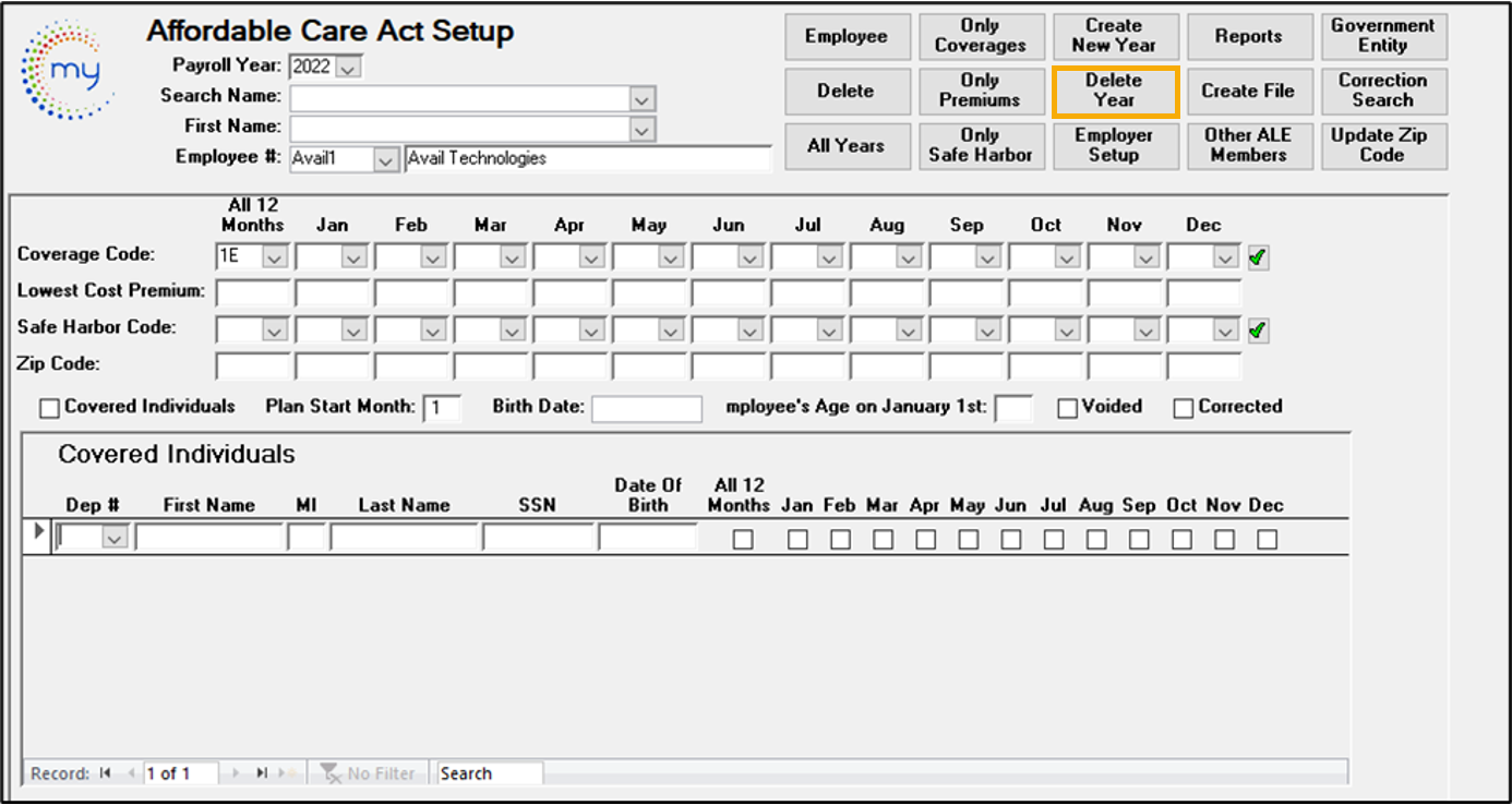 - Only those employees whose payroll status is ‘Active’ at the time the new payroll year is created will be included in the reporting year’s data. Employees who had monthly data entered for Coverage, Premium, and Safe Harbor in the previous year will have to be edited in the reporting year; all fields will be blank.