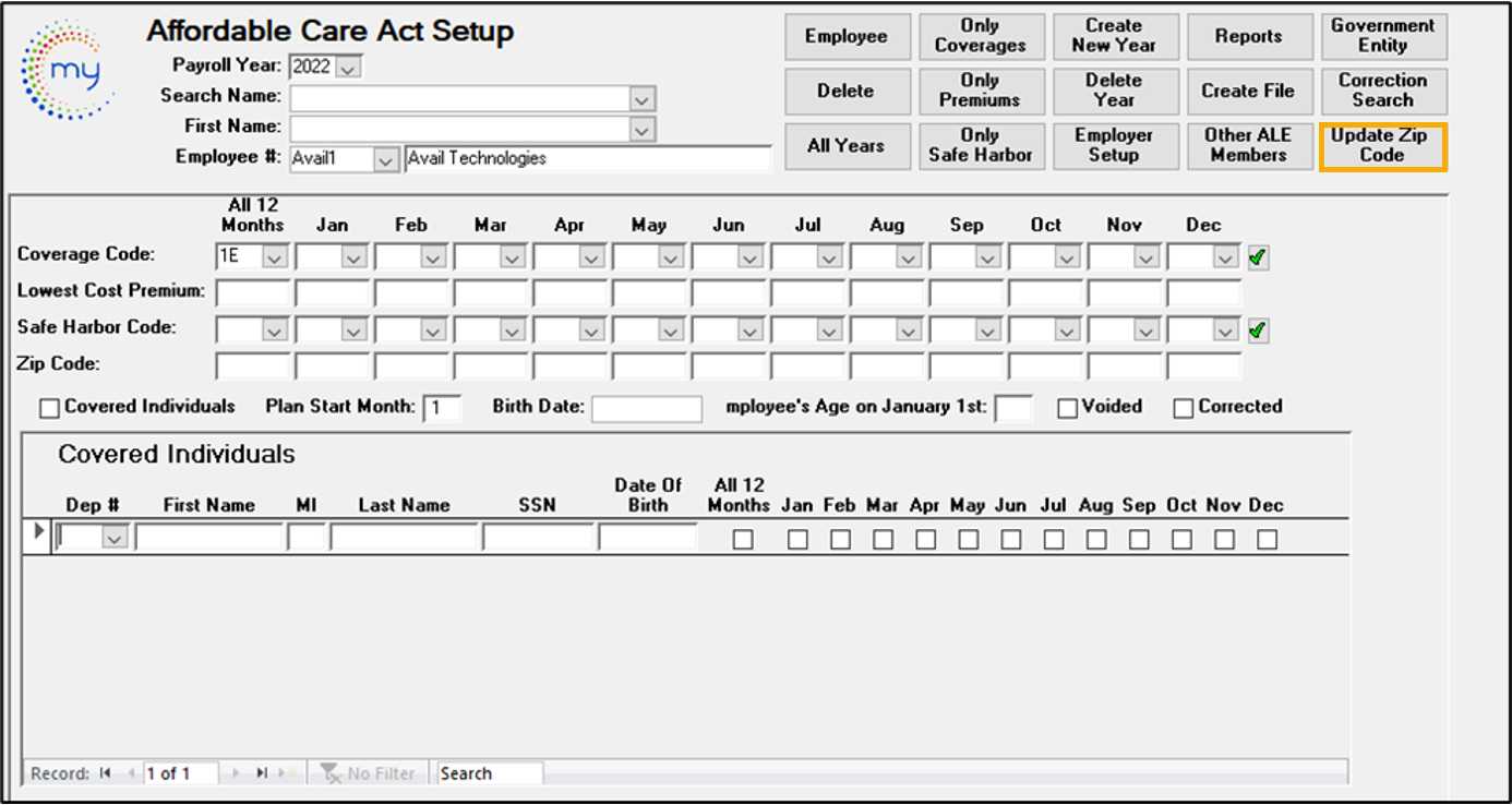 - Click Update Zip Code to update employees’ zip code on the ACA form (if applicable) from the data on the employee master form. Miscellaneous codes must be pre-defined to identify which ACA Coverage Codes are applicable for this process. The codes listed are an example, the user must determine which codes are applicable to their reporting requirements.
