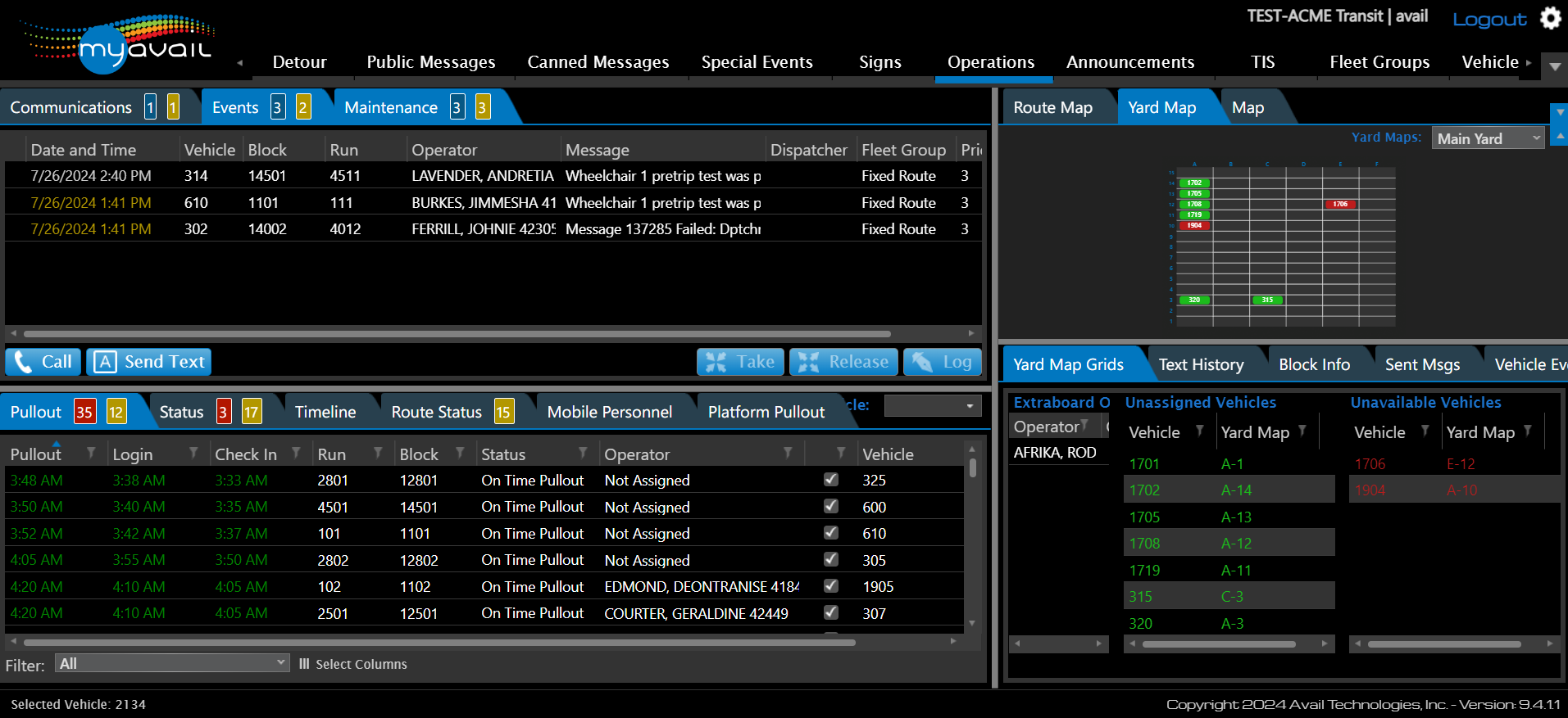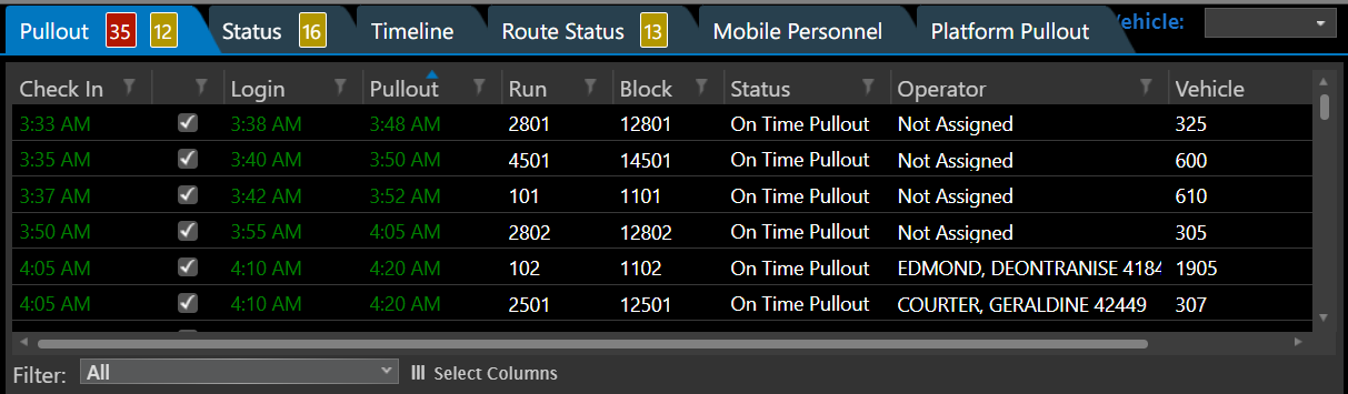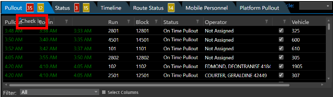 The Pullout Gird is a tool that promotes pullout efficiencies for agencies. It informs dispatch about operator check in times, tracks when vehicles are logged into and when they pullout for their first revenue stop. Dispatch can use the check in column to begin tracking these events. Please see the Pullout Grid article for more information. This article discusses how to order the columns in the manner in which these events occur.