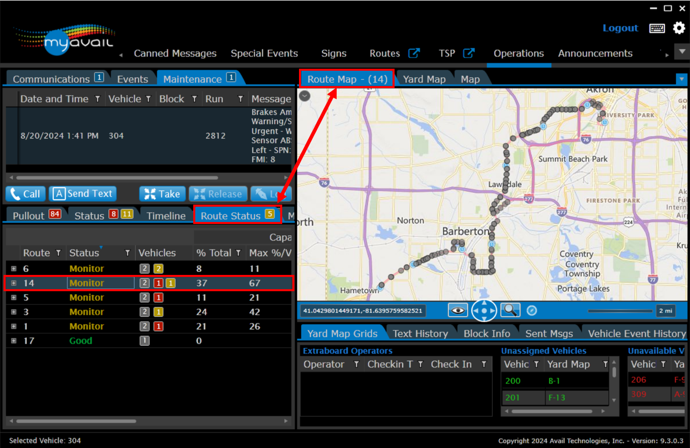 To optimize using these tools, it is important to select the route for focus from the Route Status tab to view the vehicles on that route on the Route Map: