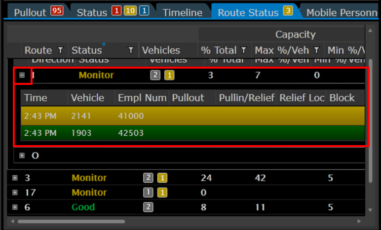 How can I drill down into an individual vehicle record from the Route Status Tab? Begin by selecting the plus sign located to the left of the route to view the vehicle statuses for that route. After selecting a route, the plus sign toggles to a minus sign: