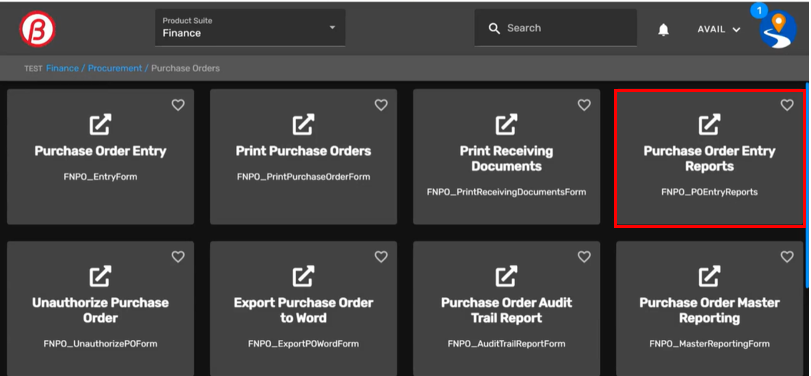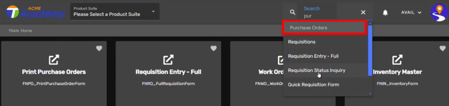 Then use the quick Search field to locate the Purchase Order Master Reporting card. Simply enter the first few letters of purchase to bring up cards that begin with 'pur', and select what you need.