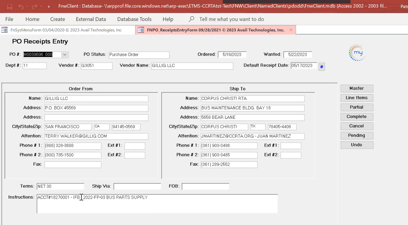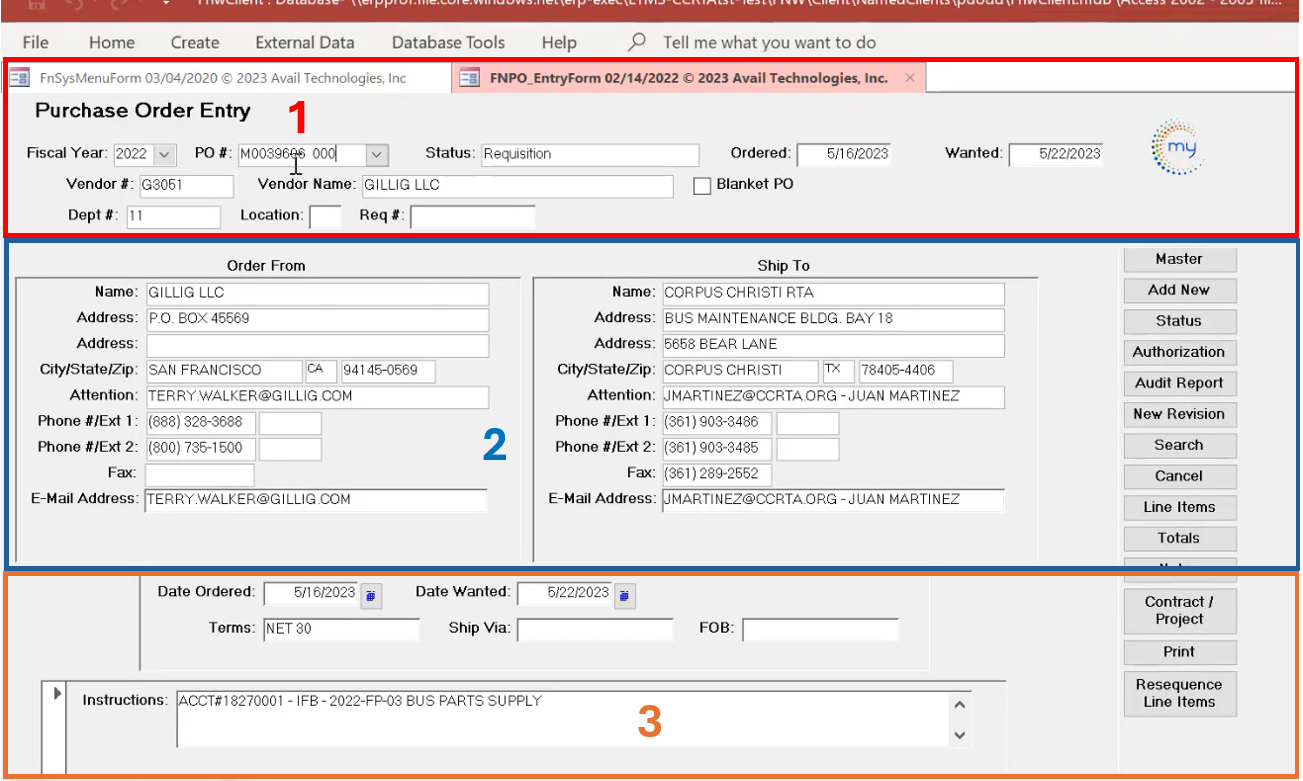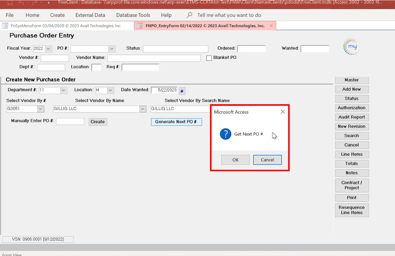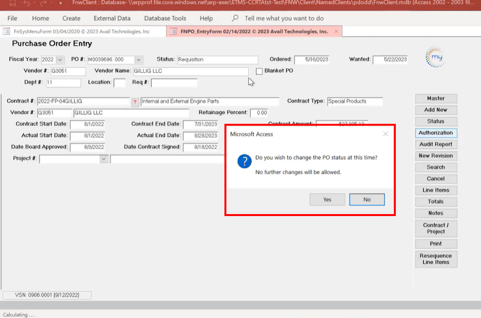 - WHY: What if you plan to order a part from Gillig but they don't have it. POs are not editable after they've been authorized. Double check all vendors before pressing OK. Maybe NAPA has the part, and you prefer to use them instead. If you check first, while the order is still in a RQ state, it is easily modifiable. Just select Cancel here, if you are unsure, then do your research before committing.
