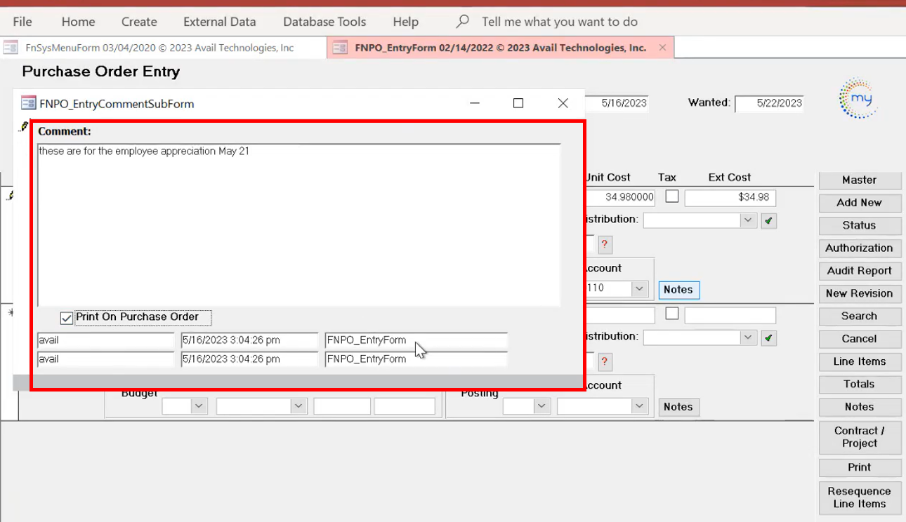 If there have been revisions for a purchase order, you'll see the date and time stamps, along with the updates that were made on the requisition form.