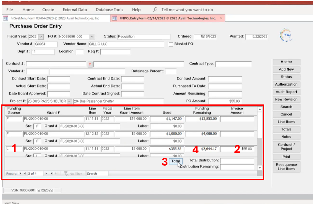 - When you input the funds needed on the PO, then select the Funding Source, the software auto-calculates any monies distributions and displays remaining balances for each funding source used.