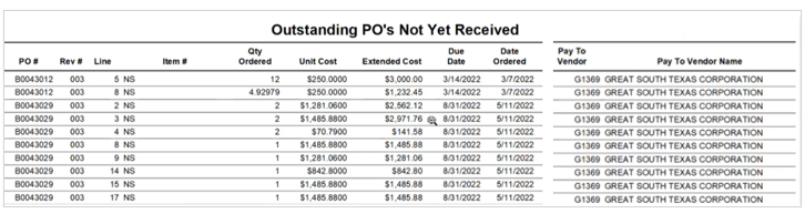 Use the scroll bar to review all columns and you'll see the PO#, Rev#-any revisions if used, Line Item IDs, Costs per Unit, Estimated Cost, Due Date, Date Ordered, and Vendor information ('pay to' and the vendor address).