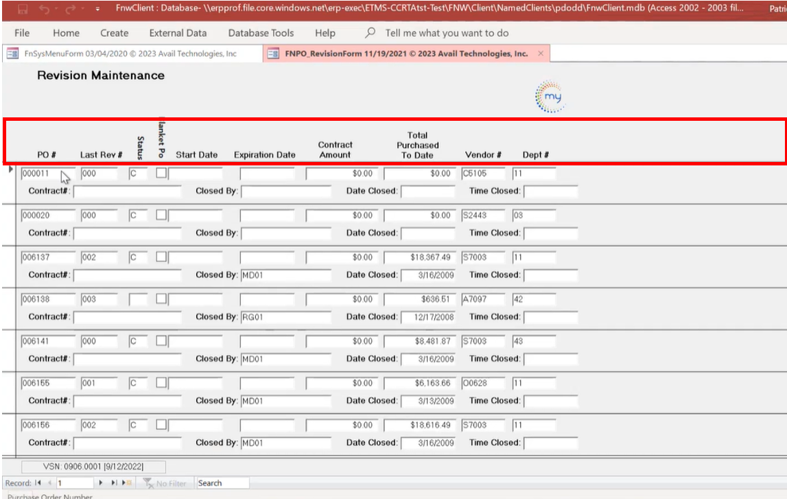 The opened document provides you with information about the contact/project each PO is attached to. You will see the latest revisions, the Status ( C = the PO is closed), and if it's a Blanket PO order (recurring POs pulls from a capped funding source), Start Date and Expiry, the Vendor# being used for the order and the department.