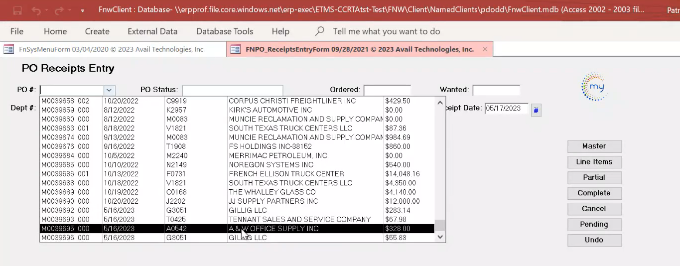 - PO ID# displays. In the example below, the ID is M0039696 000. Why: All POs are created with revision 000. When receiving a PO, and all items didn't arrive, the software will automatically create revision 001 for the back ordered items, for receiving purposes. Additional revisions can be created to add on to the PO if needed.