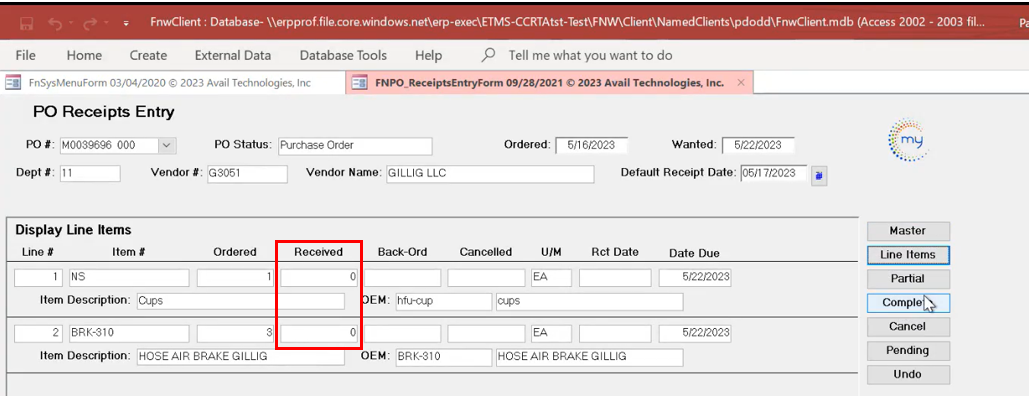 Press the Complete button if the entire order was received. The Received fields on the PO will display values. For example, the cups we ordered will display a '1', and the 3 hoses will display a '3' in the Received fields if all items were received.