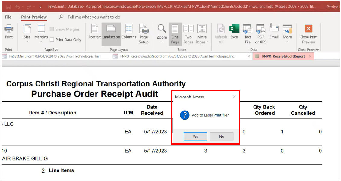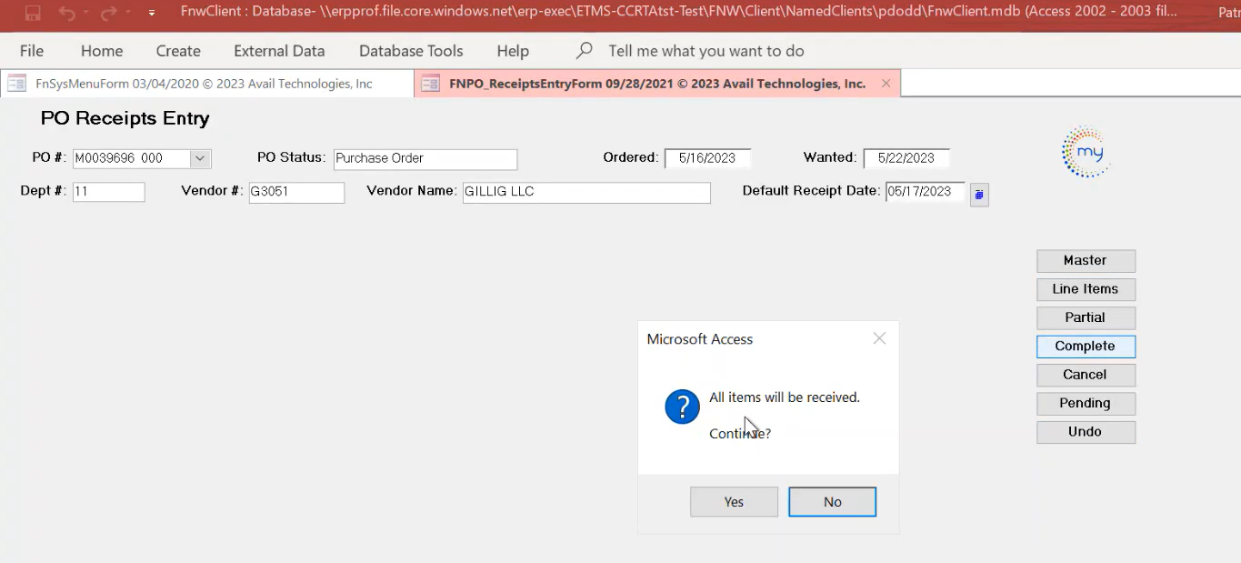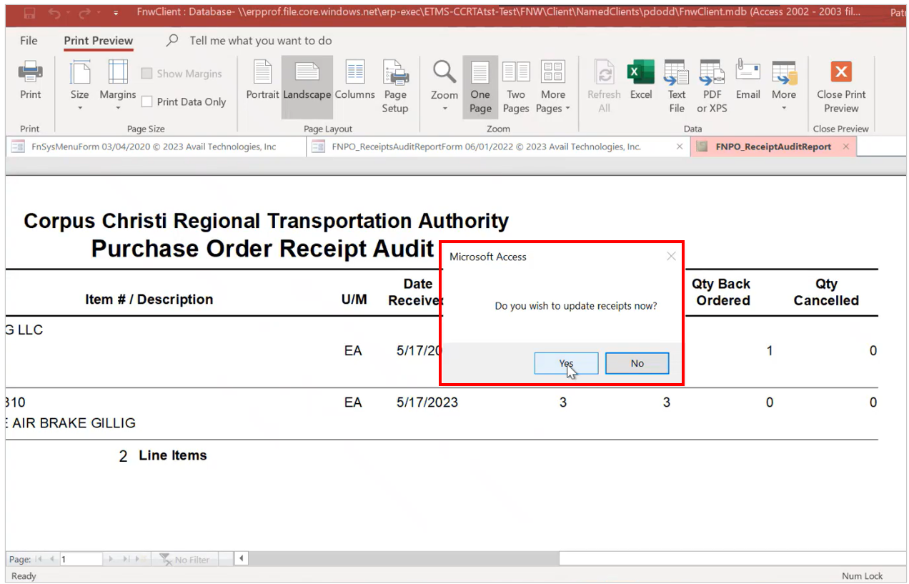 The next popup message confirms the transfer of this data to update the Purchase Order. Select Yes.
