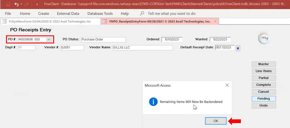 The next popup indicates that this PO is completed. Press OK.