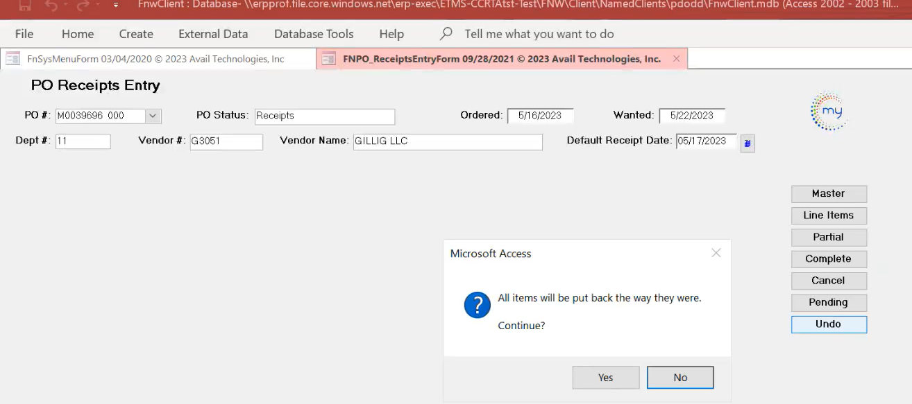 Use the Undo button to undo the last input on the PO form. Let's say you began working on one and realized a part was damaged, or you need to step away from your desk. You can use the 'undo' feature to return the PO back to its state before you began working on it. Press Undo.