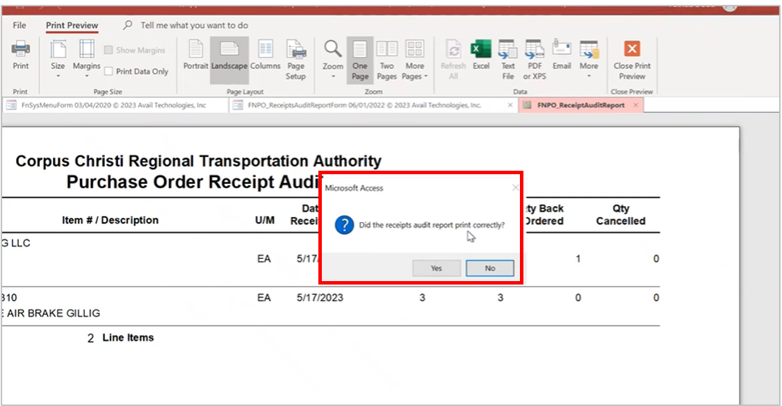 When you close out of the Print Preview, you'll see a popup to confirm if the receipt printed correctly. Select accordingly.