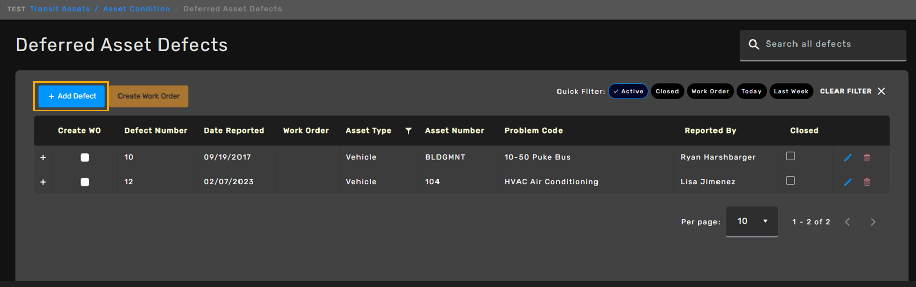 Defects can only be deleted if they are Active and not assigned to a Work Order. If a defect cannot be deleted, the Trash can icon is replaced with a Lock icon.