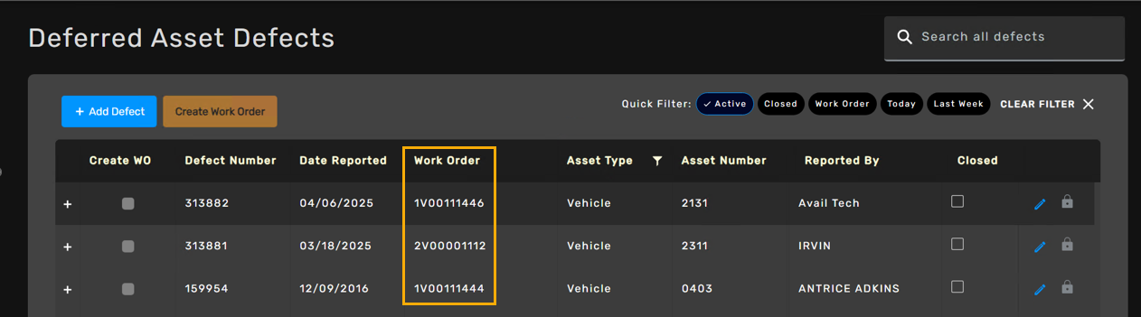 - Work Order (Defects that are attached to a work order)