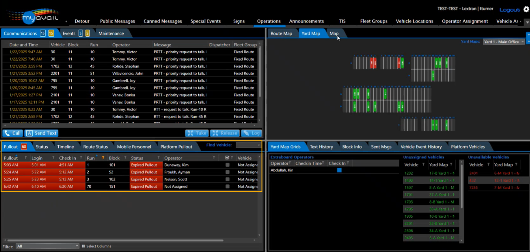 The myAvail Pullout Grid can be used as a stand alone product or a display for a customer utilizing a "Daily Operations" package. When integrated with a daily operations package, the pullout grid will receive updates from the "Daily Operations" package on the 'Operator' and 'Vehicle' fields.