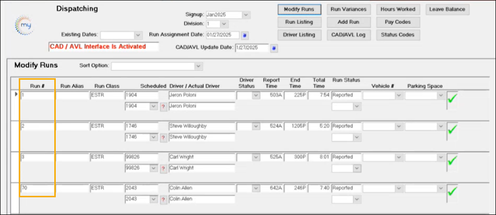 Runs 1, 2, 3, and 70 on the Dispatching form match Runs 1, 2, 3, and 70 on the Pullout grid.