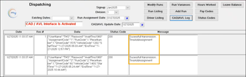 Changing Drivers on the Dispatching form and selecting CAD/AVL Log button, will produce the Successful transmission message confirming the change was successful, and as a result the Operator fields will also be updated on the Pullout grid.