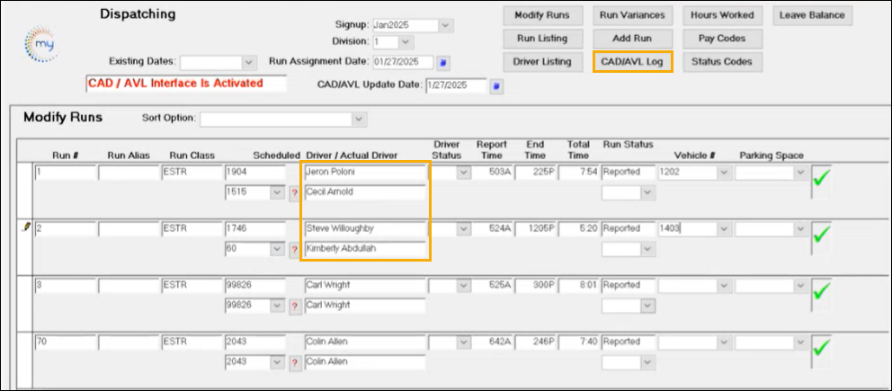 NOTE: The scheduled Driver on both the Dispatching form and the Pullout grid will only match if the rostering has been filled out in both systems. Pullout Grid is populated from Dispatch > Operator Assignment Tab. AD Dispatching is populated from Operator Timekeeping > Rostering..