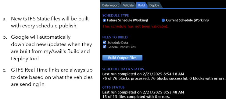 - Then we create a GTFS Static feed and upload it to the dashboard. The Google dashboard will flag any errors and warnings for the agency to correct. TIP: Upon import into Avail’s system, validations are also run against the data to confirm accuracy