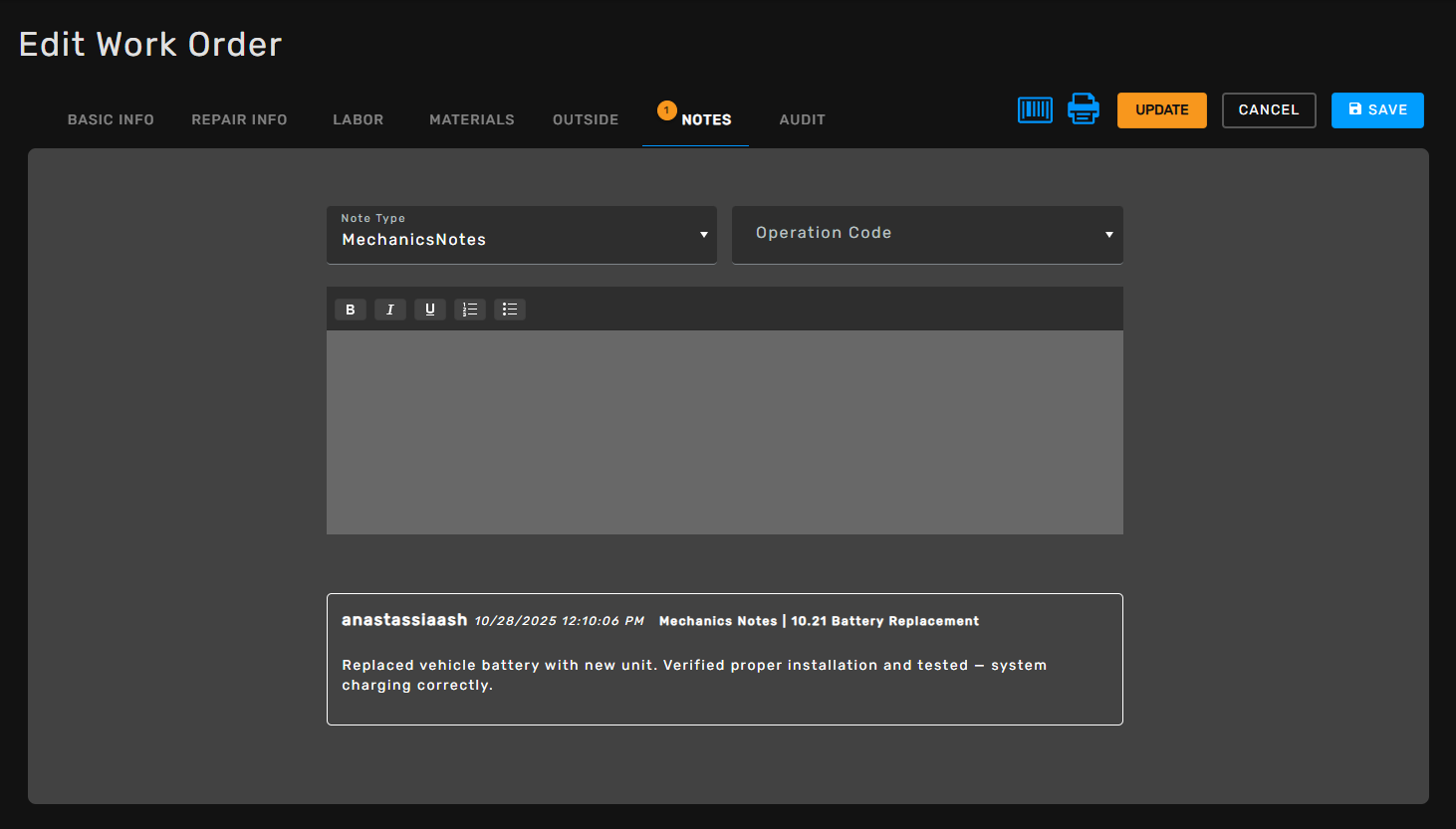 When clicking the Notes button, the form appears ready for a new note to be created. New notes are created by selecting a Note Type and labor Operation Code that most closely describes the issue. Click Save when completed.