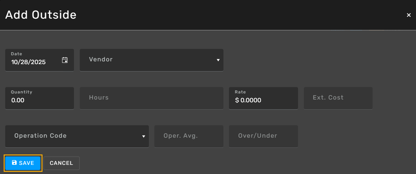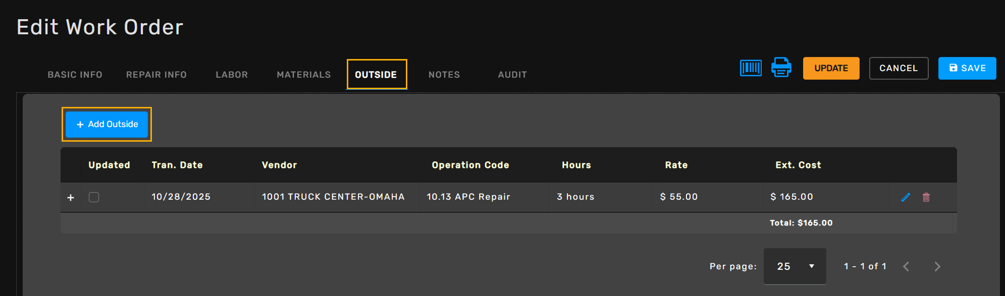 Fill in any Outside labor information on the Outside tab, view existing outside work records or click the + Add Outside button to create new entries.