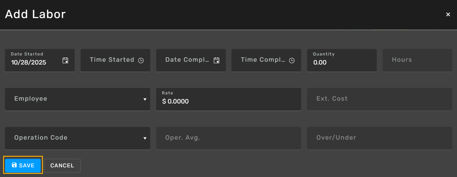 The Date Started field will default to the current date. After entering labor information, select Save to save the record.
