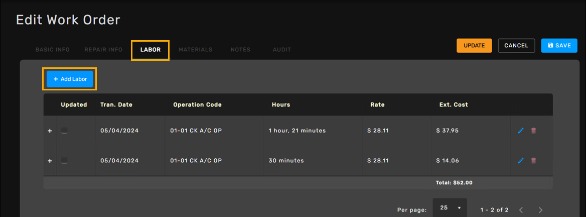Fill in labor information for the WO on the Labor tab, view any existing labor records and/or click the + Add Labor button to create new labor records. The default page size is 25 records.