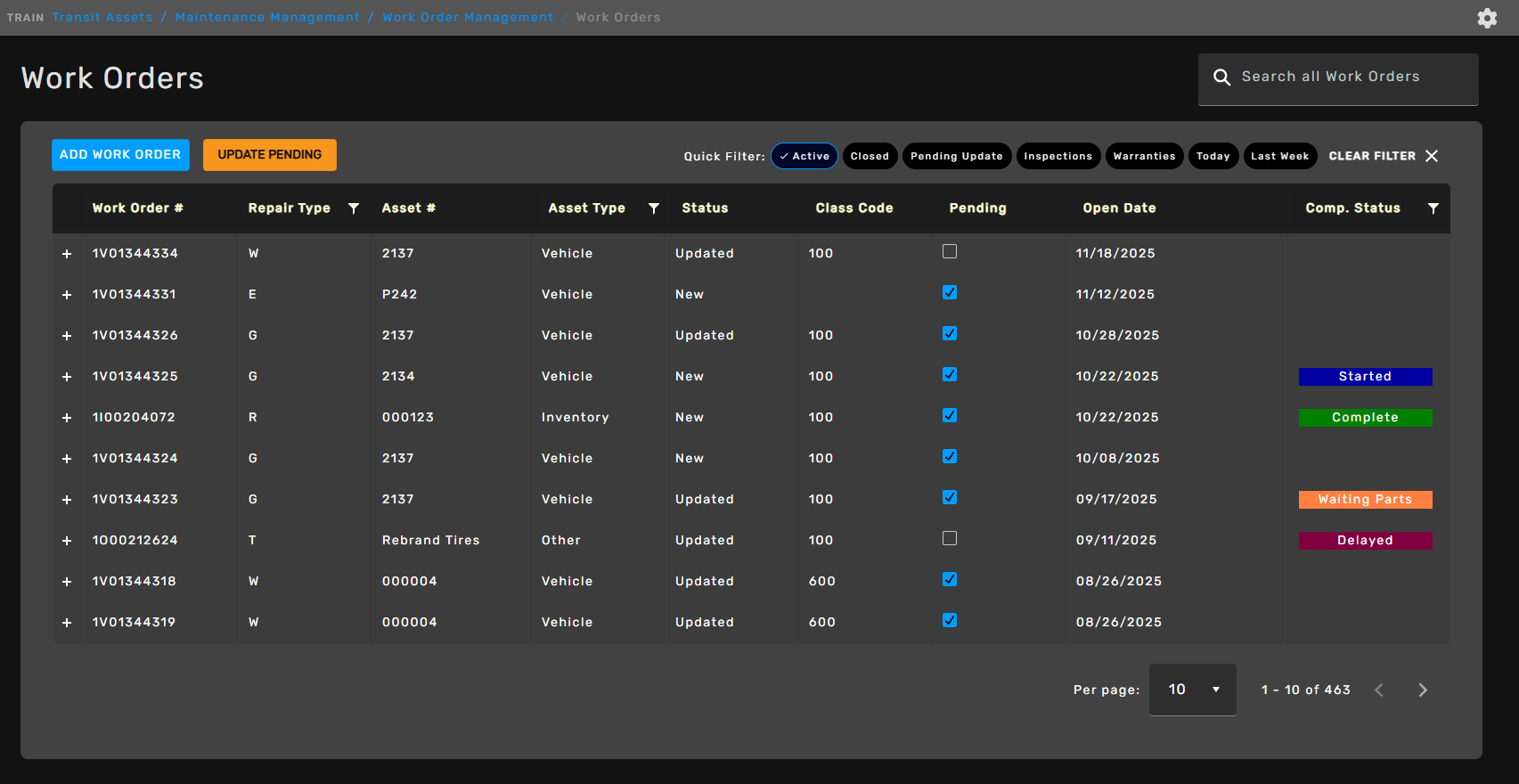 The Work Orders page is designed to give supervisors a complete view of all work orders in awaiting assignment, actively being worked or recently closed. From this screen a shop supervisor can search, filter and sort all work orders.