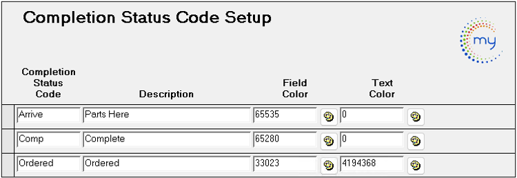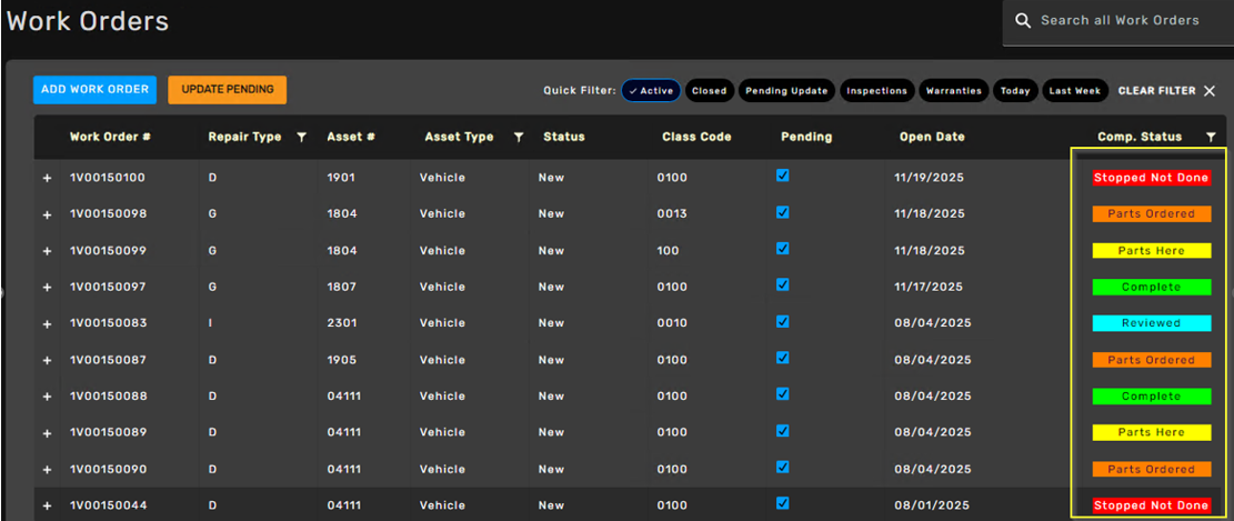 The Completion Status column displays the completion status for each open WO. They can be set up with different colors in legacy tools.