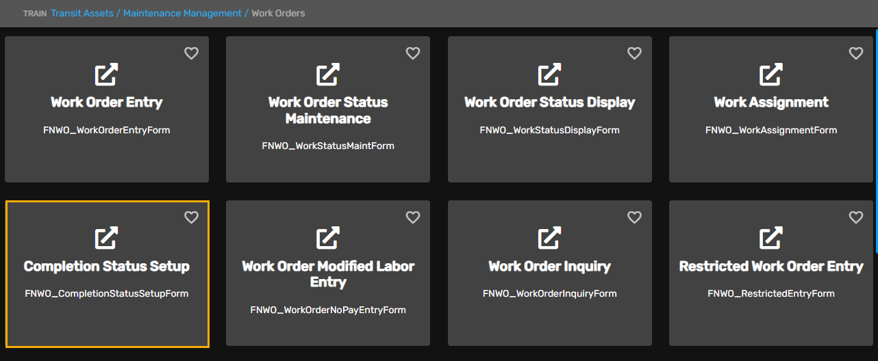 Navigate to Transit Assets/Maintenance Management/Work Orders/Completion Status Setup.
