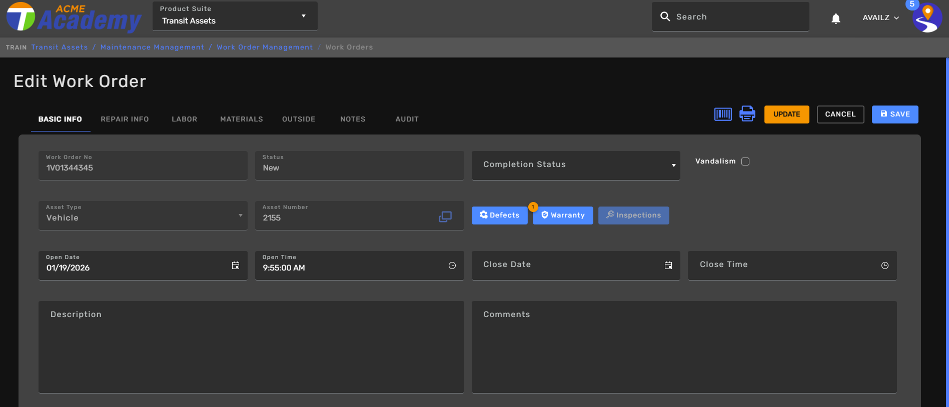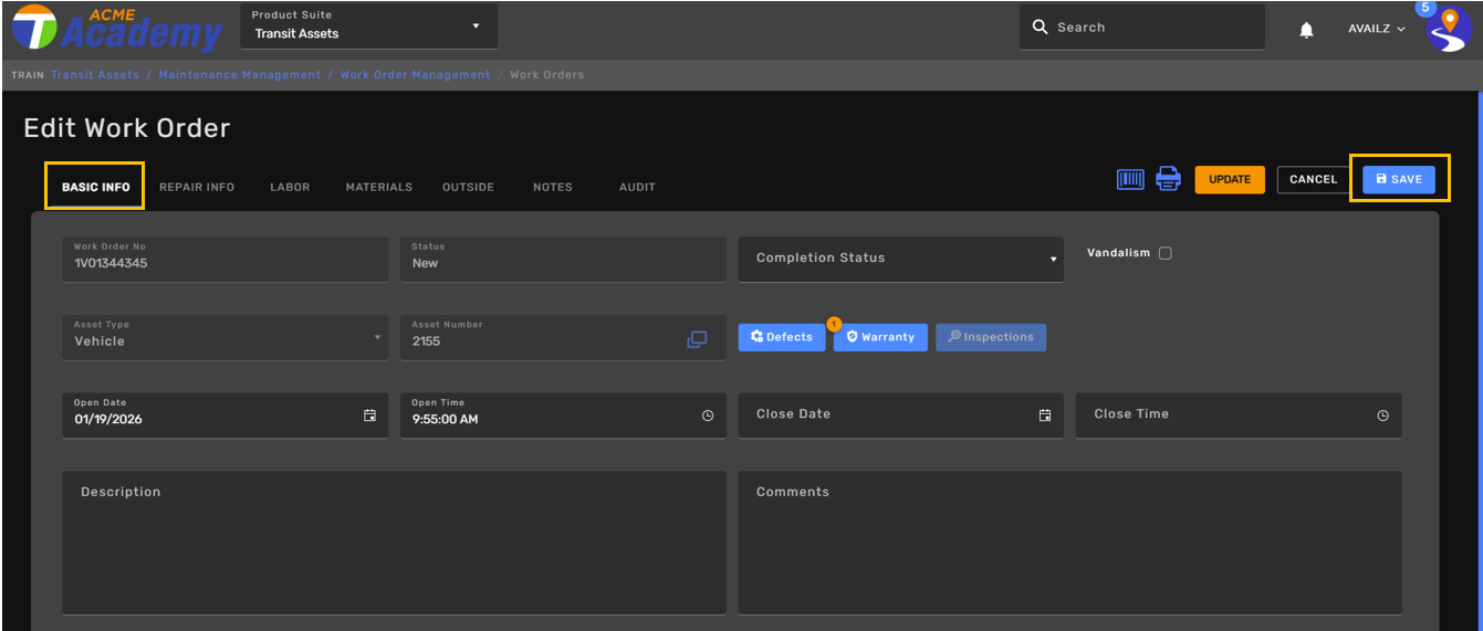 The user can fill out the basic information about the WO on the Basic Info tab.