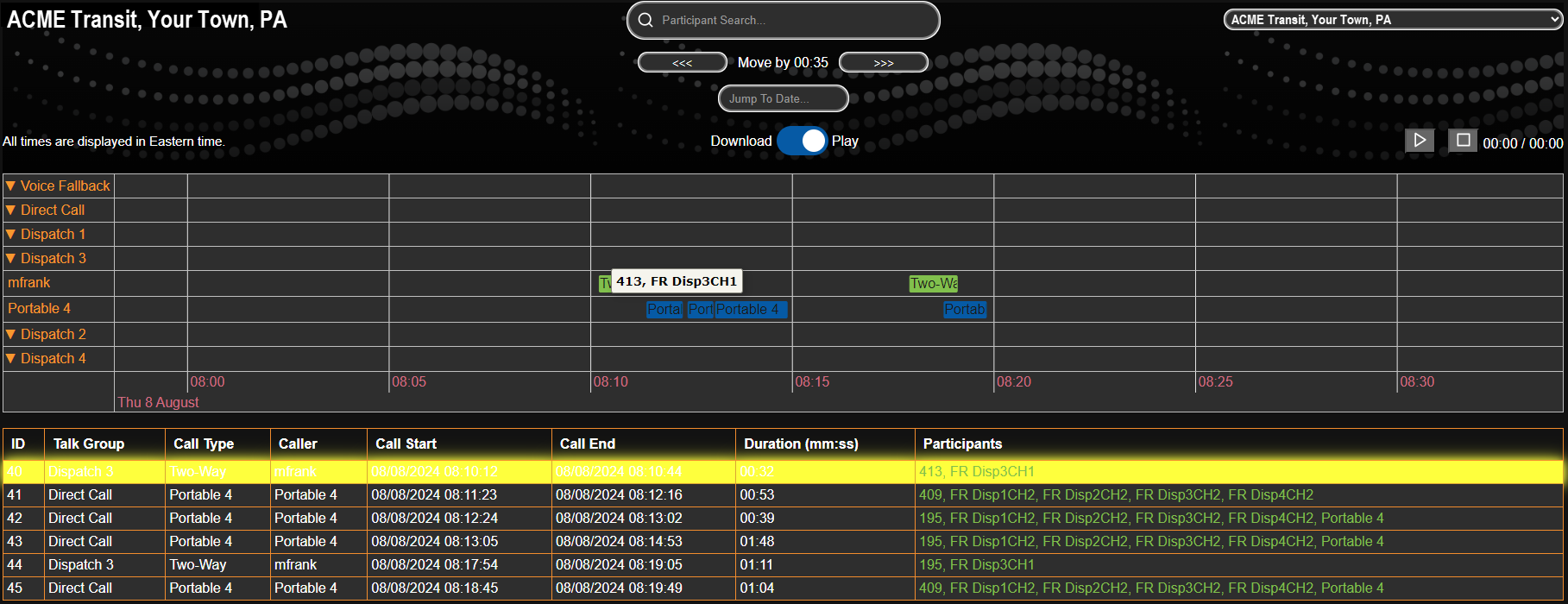 The VoIP Recording Timeline is a visual report that provides detailed call data and playback options for reviewing voice communications. This ensures effective communication management and contributes to efficient and safe transit operations.