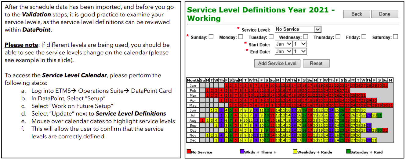 IMPORTANT: Define all service levels in ETMS for the entire current year, to prevent any issues and use of the digital schedule for the upcoming year well before January 1st. This prevents disruptions, as mentioned above, to avoid issues when you anticipate using the schedule.