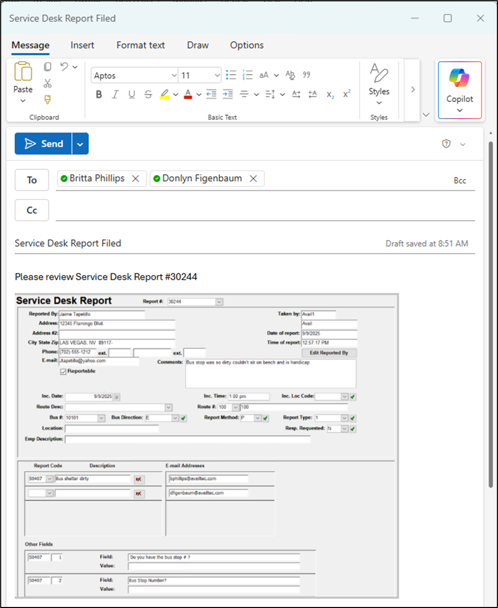 • Subject: Service Desk Report Filed