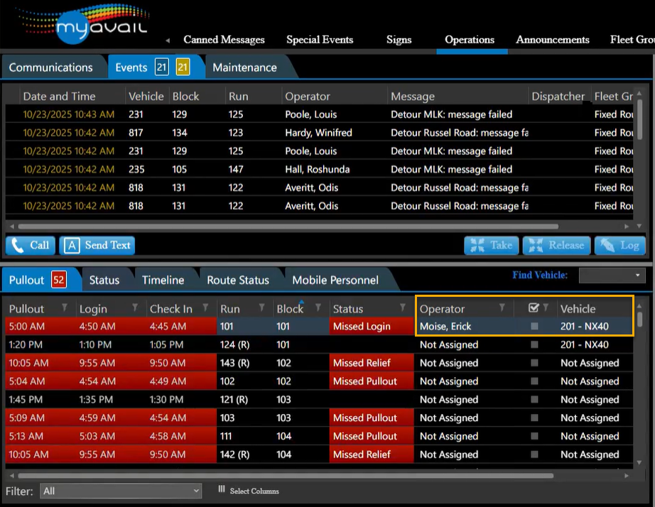 This integration provides a real-time connection between myAvail Operations and OptiBus OPS. Dispatchers perform all operator-to-run and vehicle-to-run assignments within OptiBus OPS. myAvail then retrieves and displays these assignments in the Pullout Management tab within myAvail Operations.