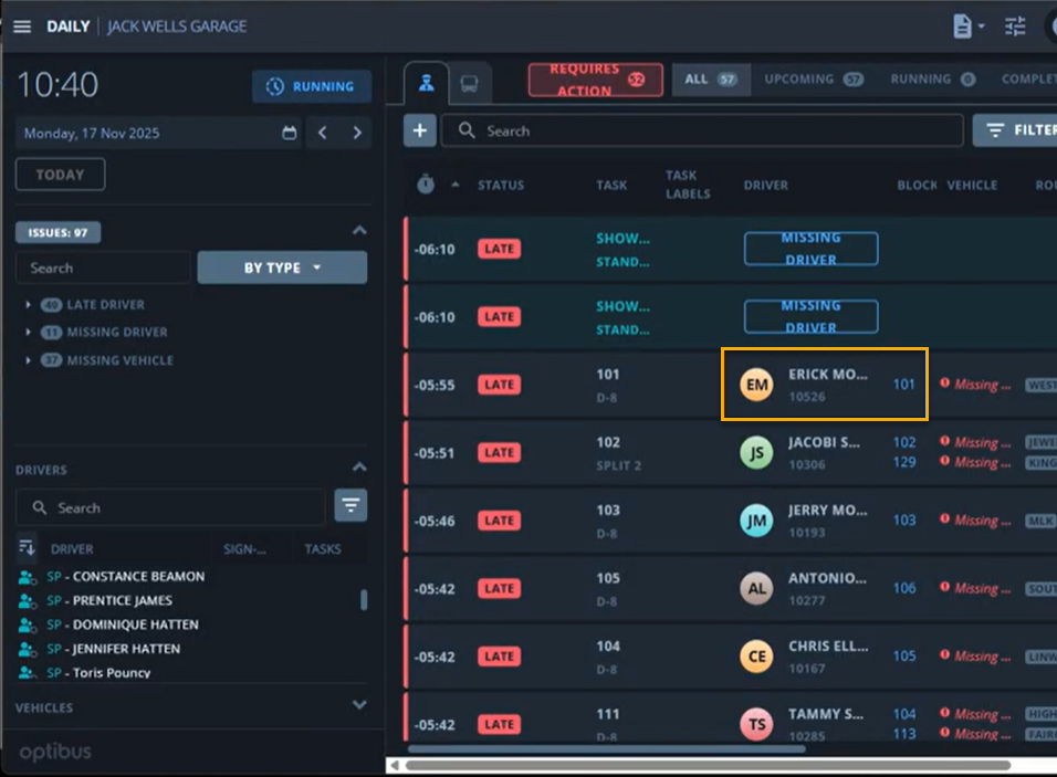 - Dispatchers assign Operators and Vehicles to Runs/Blocks in OptiBus OPS.