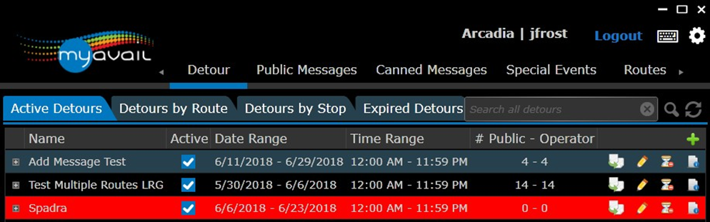 After you save a detour, myAvail adds it to the list in the Active Detours tab. New detours are highlighted in red, as shown below, because they have not been reviewed yet, or saved by the user.