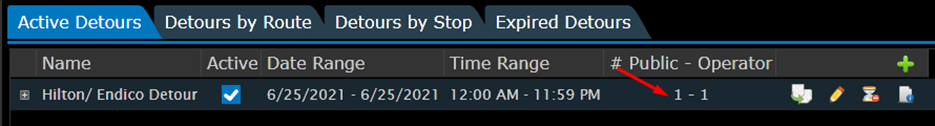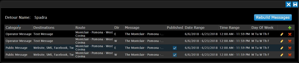 To rebuild these messages, click the Public - Operators Message icon for the Active Detour. This icon opens a popup window that displays all the system generated messages for the detour.